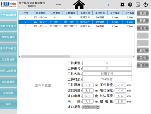 李榮團隊開發了一套激光焊接裝備數字化控制系統人機界面軟件,對于提升設備整體的穩定性和信息化程度意義重大。該軟件基于QT平臺使用C++語言編寫,在工控機運行顯示,通過外接鍵盤來輸入參數,手動或者自動執行焊接操作。具備生產信息、生產數據監控、參數設置、歷史數據追溯及數據處理、報警及維護、監控顯示、信息化看板等主要功能模塊。基于MYSQL建立工藝數據庫,工藝數據與工件信息和操作人員相匹配,實現信息的存儲、分類整理和統計分析,并能夠實現與上層企業信息管理系統的互聯互通,企業可隨時導出需要的生產數據,方便企業進行生產規劃、生產進度管理和產品質量追溯,推動企業向數字化工廠發展。
